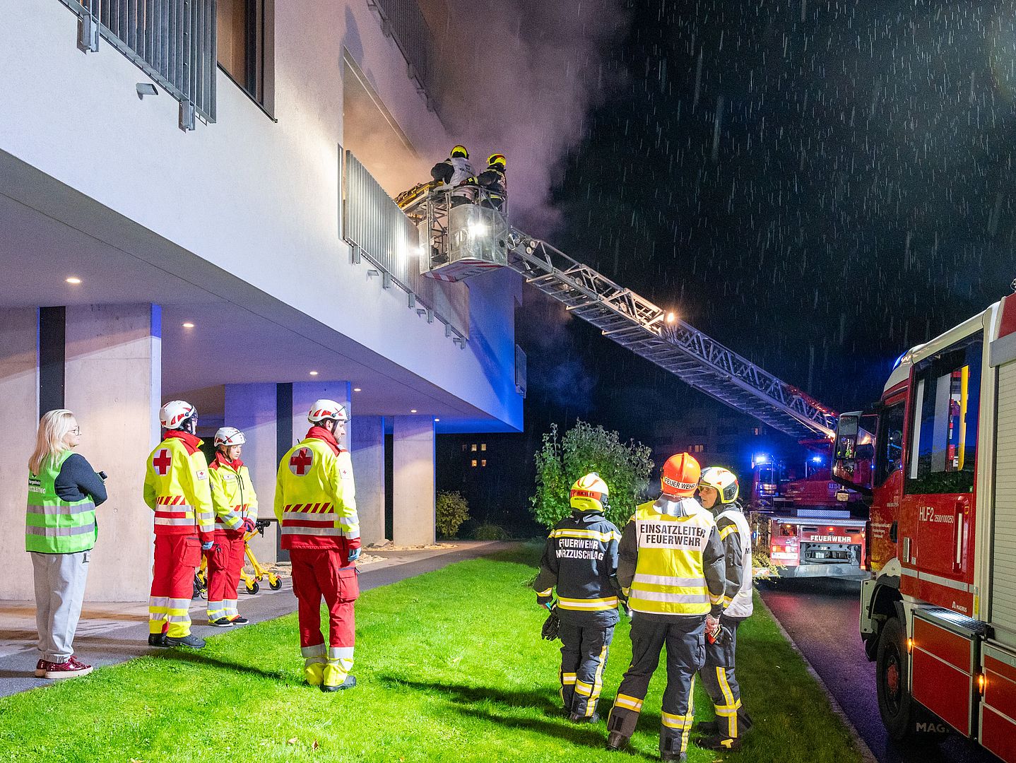 Das Übungsszenario sah eine starke Rauchentwicklung im Gangbereich auf Ebene 1 vor. Ziel war es, alle Bewohnerinnen und Bewohner – darunter auch mobilitätseingeschränkte Personen – rasch, geordnet und sicher zu evakuieren. Während sechs Bewohnerinnen und Bewohner intern in den nächsten Brandabschnitt gebracht wurden, erfolgte die Evakuierung eines weiteren Bewohners spektakulär über die Drehleiter der Feuerwehr.